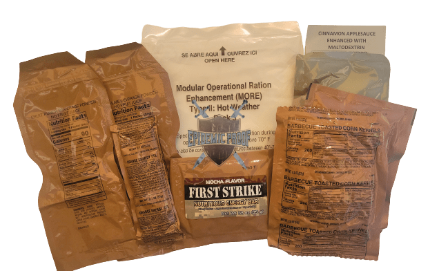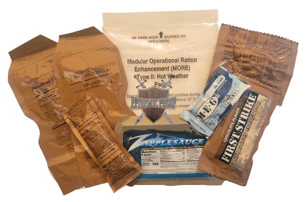 Ration Information: Modular Operational Ration Enhancement Packs (MORE) Type II [Hot Weather] are designed to supplement standard MREs with additional calories and environment-specific components for higher temperatures. Each Case includes 8 each of the following menus [Please note, Menu contents are subject to substitution, removal and/or change by the manufacturer]: