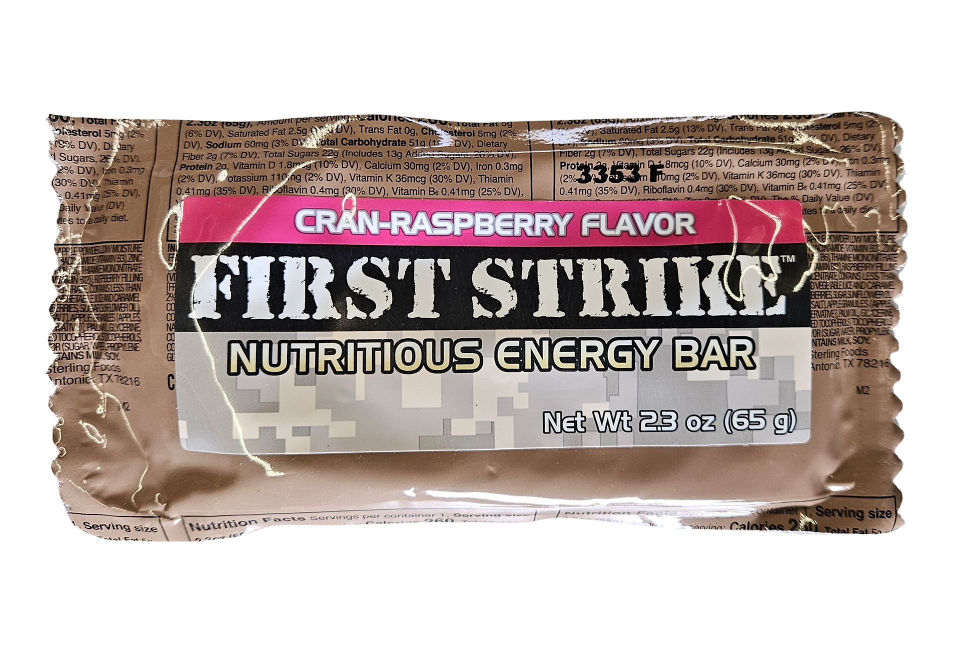 Full-Size Cran-Raspberry First Strike Bars are designed to keep you fueled and focused in the field. With a sweet and tangy blend of cranberries and raspberries, these bars pack serious energy in every bite. Dense, chewy, and loaded with carbs and protein, they’re built for endurance and long-lasting fuel. Whether you're on the move or need a quick refuel, this bar has your back!