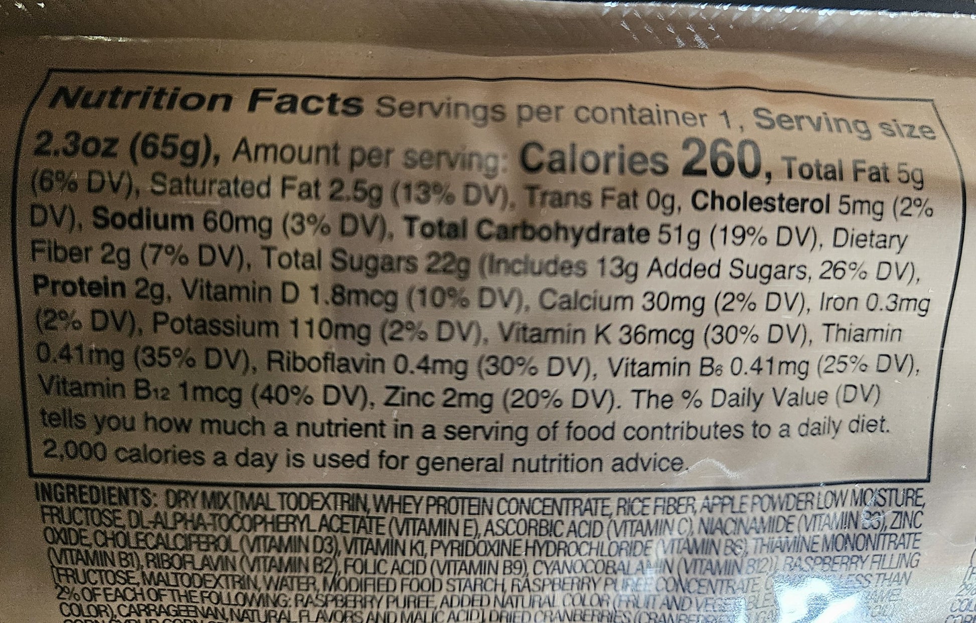 Other Information: 2.3oz [Full Size] 250 calories; 3g protein, 6g fat and 47g carbohydrate.