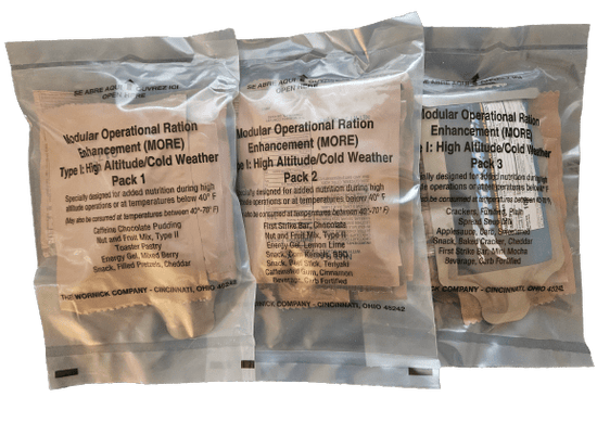 Ration Information: Modular Operational Ration Enhancement Packs (MORE) Type I [High Altitude/Cold Weather] are designed to supplement standard MREs with additional calories and environment-specific components for colder temperatures. There are 3 different menu selections [Please note, Menu contents are subject to substitution, removal and/or change by the manufacturer]: