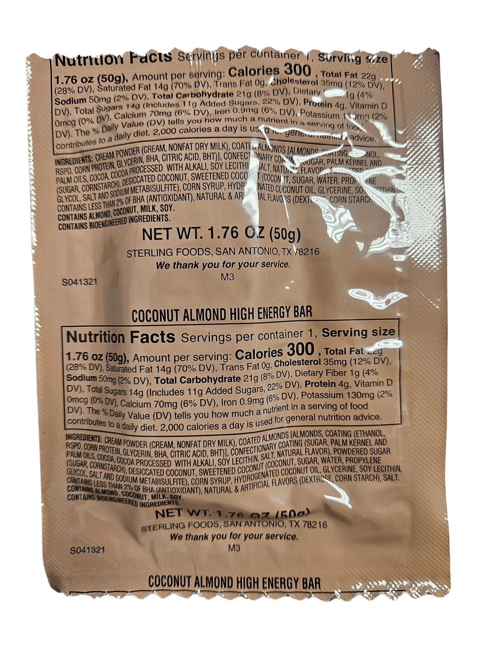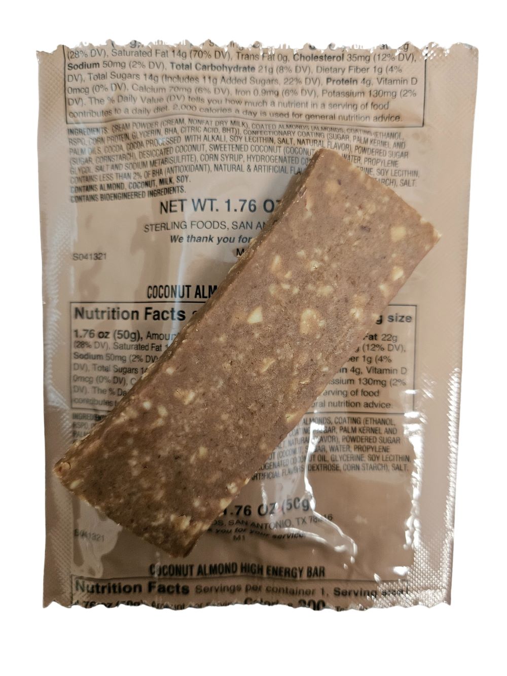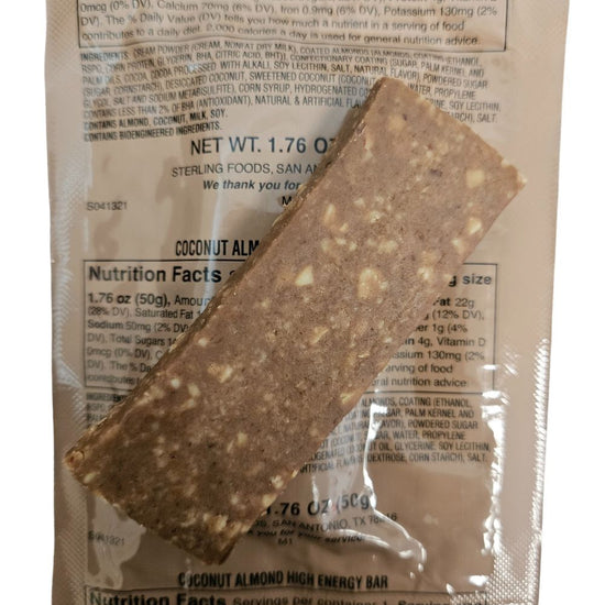 Inspection Date: 3/2027 [Packed 3/2024]. Every Coconut Almond High Energy Bar is brand new and factory sealed. Coconut Almond High Energy Bars have a shelf life of 5+ years when properly stored in a cool, dry environment.