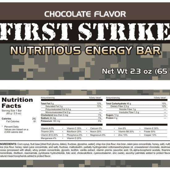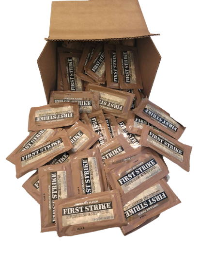 Chocolate First Strike Bars are your mission-ready energy boost, packed with rich chocolate flavor. Designed to fuel you through the toughest challenges, these bars are loaded with the carbs and protein you need to keep moving. They’re dense, chewy, and last forever!