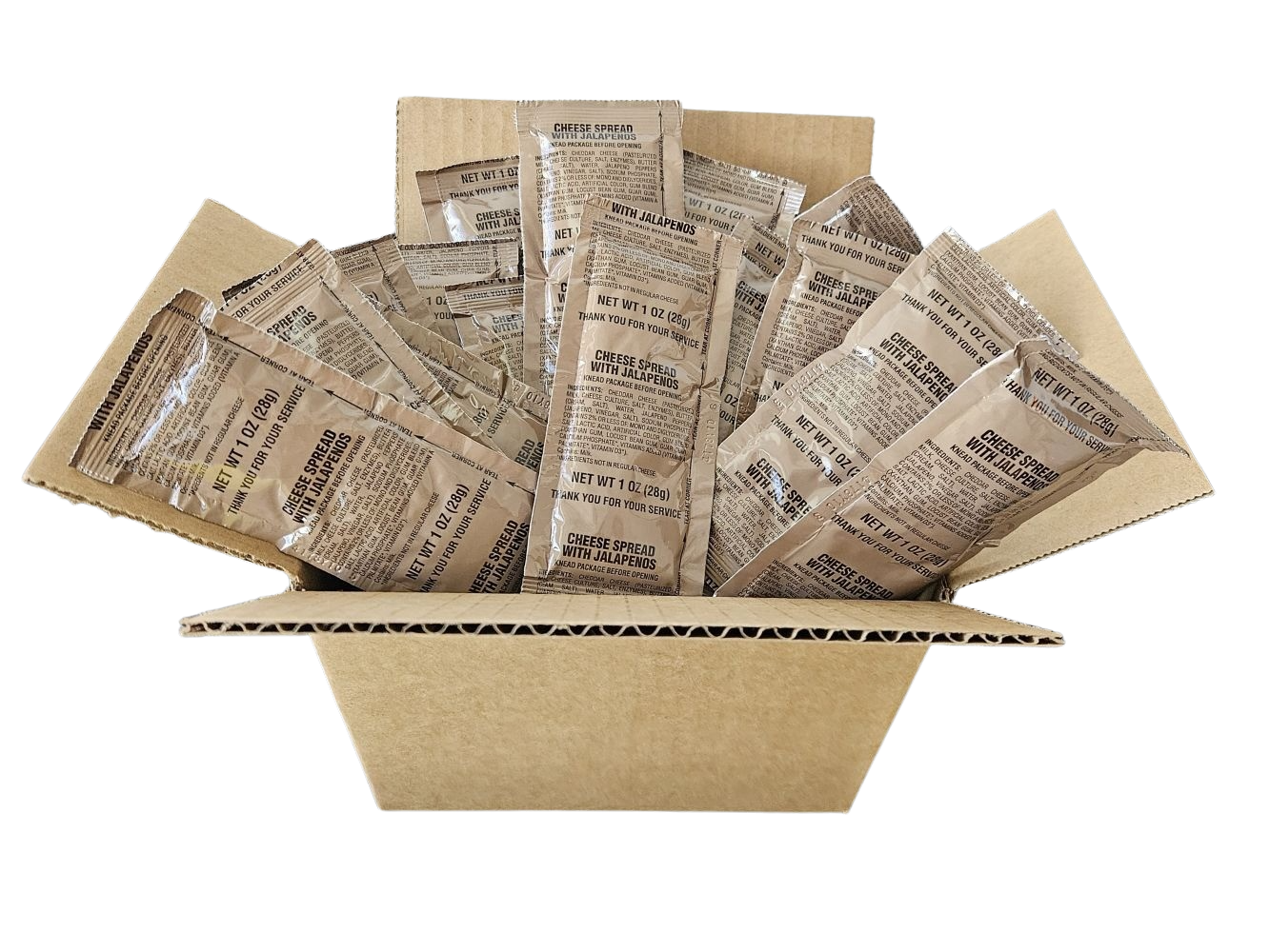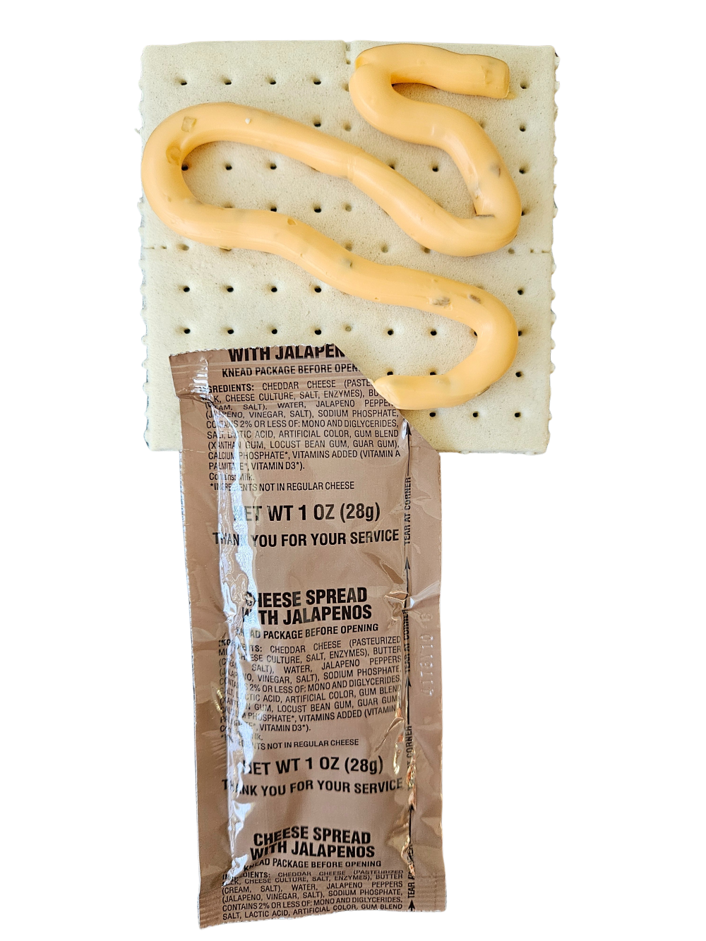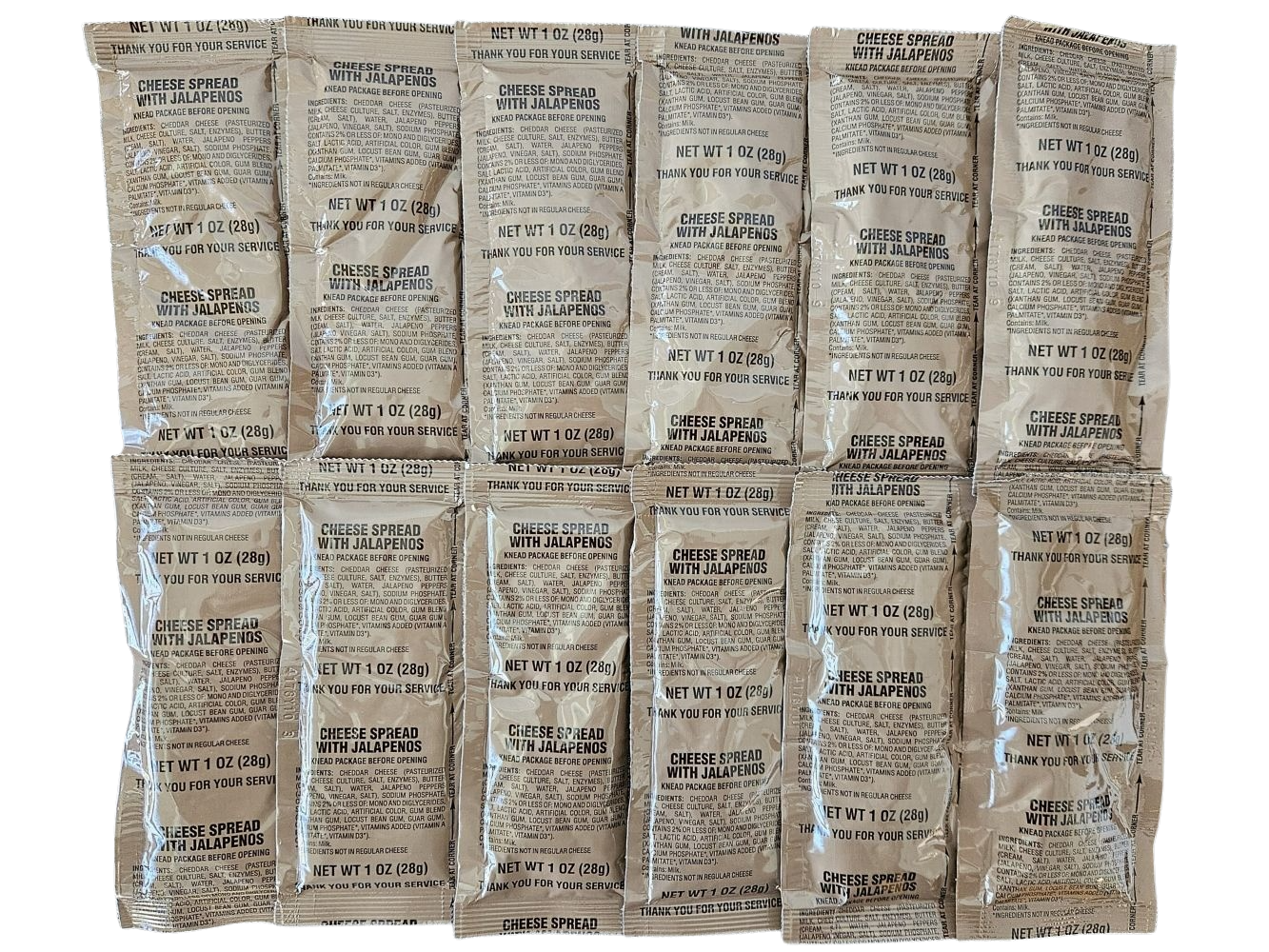 MRE Jalapeño Cheddar Cheese Packets bring the heat with a bold kick of spicy jalapeño mixed into creamy cheddar. These packets are perfect for adding some fire to your MRE crackers, bread, tortillas or as a topping to your MRE main for a big flavor boost in the field. Shelf-stable and ready for action!