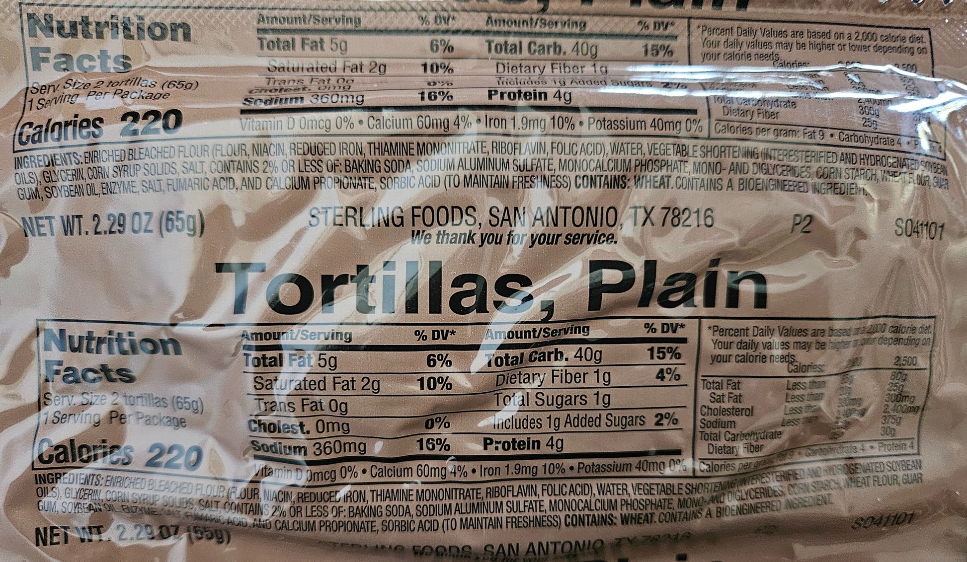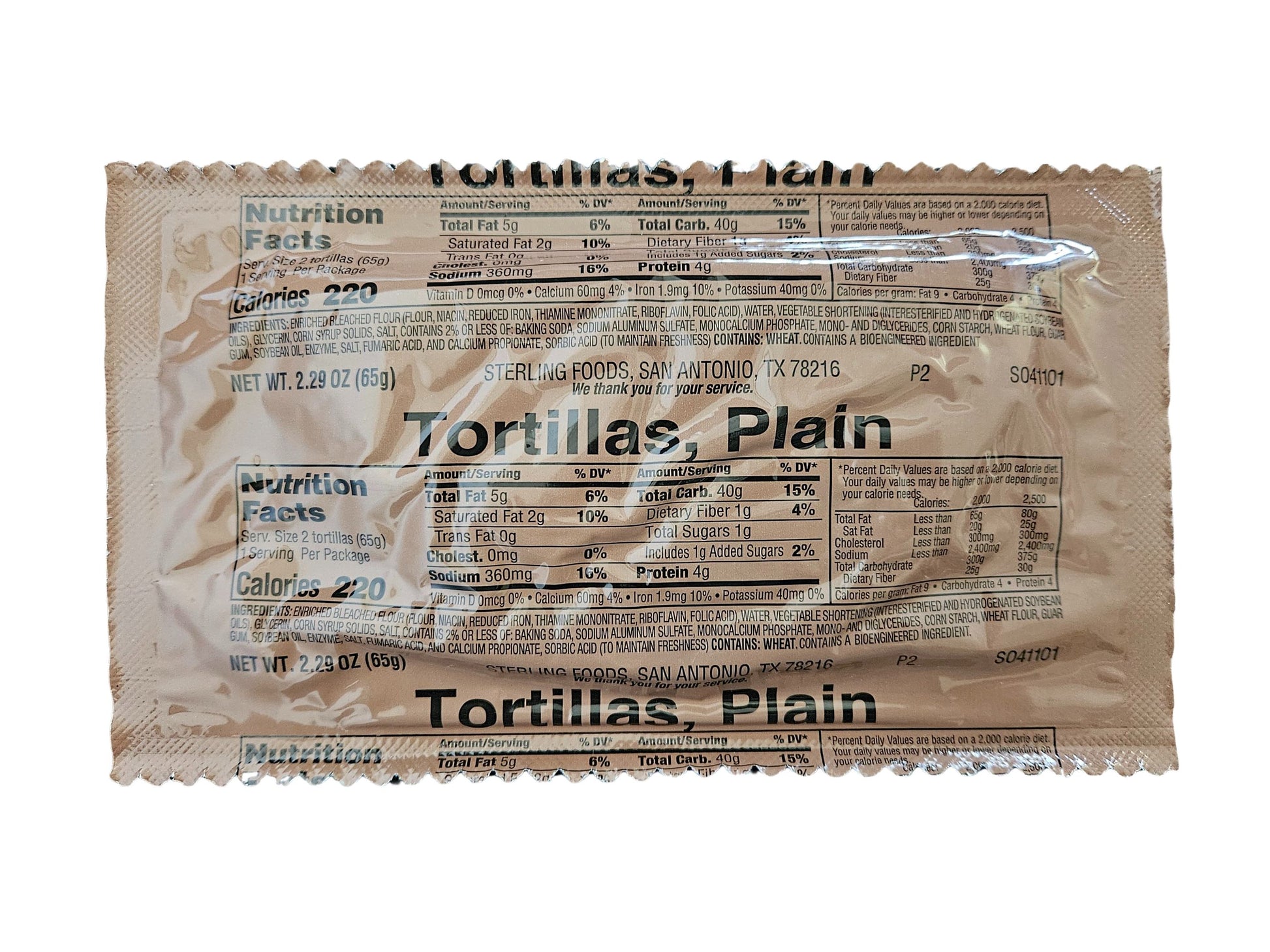 Inspection Year: 2026 [Pack Year 2023]. Each MRE Tortilla Pack is brand new and factory sealed. MRE Tortillas have a shelf life of 5+ years when properly stored in a cool, dry environment.