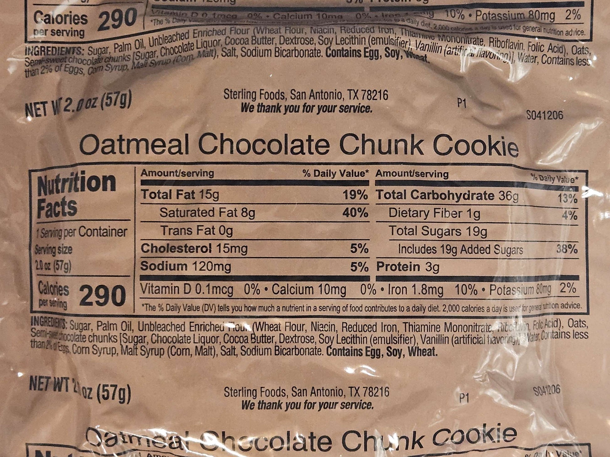 Inspection Year: 2025 [Pack Year 2022]. Every Oatmeal Chocolate Chunk Cookie is brand new and factory sealed. Oatmeal Chocolate Chunk Cookies have a shelf life of 5+ years when properly stored in a cool, dry environment.
