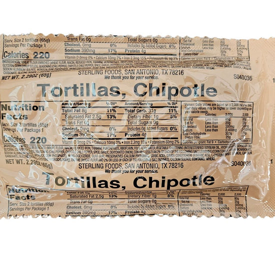 Inspection Year: 2027 [Pack Year 2024]. Each MRE Chipotle Tortilla Pack is brand new and factory sealed. MRE Chipotle Tortillas have a shelf life of 5+ years when properly stored in a cool, dry environment.